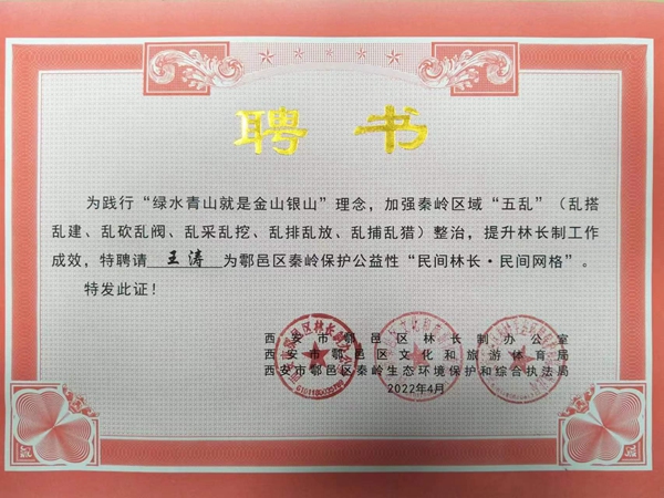 据了解,鄠邑区成立的民间林长“五员”,主要的职责是示范员、宣传员、监督员、巡护员和信息员,主要负责资源保护、森林防火、野生动植物保护、法律法规宣传、生态文明科普等活动。而王涛负责的曲峪峪道是曲峪护林检查站辖区,该辖区下设有烧柴峪、曲峪、谭峪、皂峪、化民峪,总护林面积3685公顷,辖区内共有5个专职护林员,2人一组,几乎每天都要对辖区内峪道内的森林防火、野生动植物保护和林区内的“五乱”行为进行排查。
